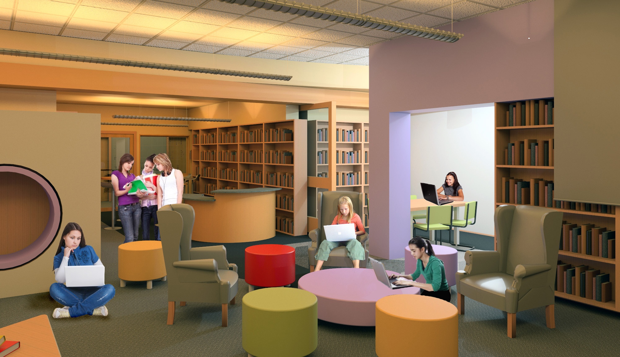The Media Hub will also house our book collection, and the space will be served by our librarians. Students will especially love the fun, comfortable, cocoon-like reading spaces, which were designed to encourage a love of reading by offering an irresistible place to curl up with a fascinating novel or an exciting comic book.