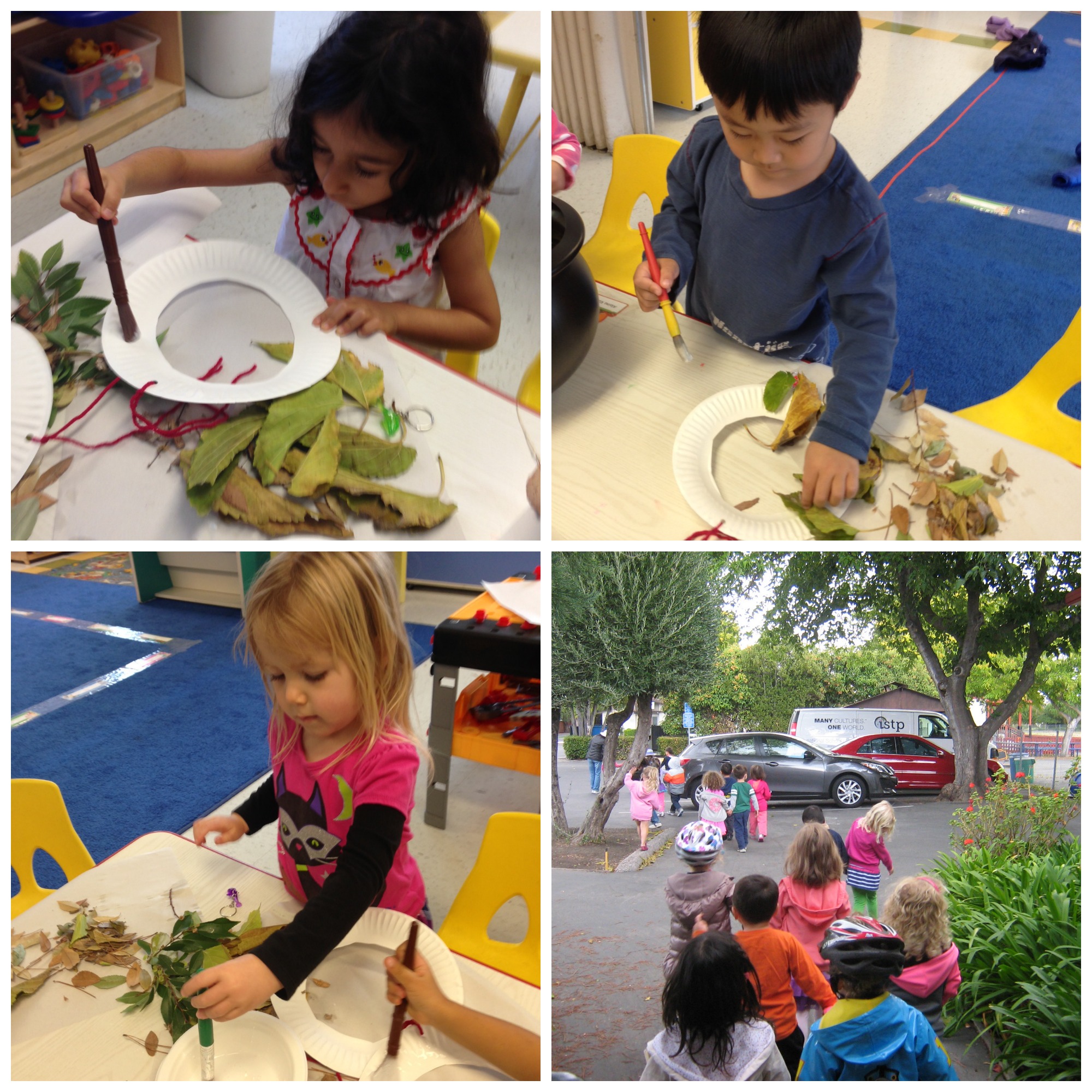 Due to very cold weather, we shortened the walk planned for today, and kept it local. The nursery took a walk to Cowper’s classroom garden and talked about all the different plants growing in it. They also created wreaths using the leaves they gathered while on their walk. The Pre-K and Kindergarten classes ventured a little further to the garden at the church right behind INTL. On their way there and back, they collected leaves, twigs, and berries of different sizes, shapes, and colors